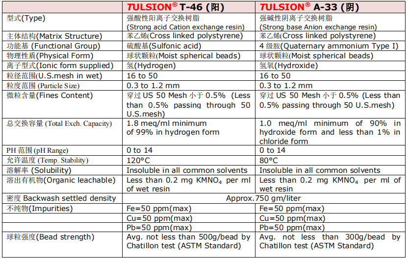 科海思采用超純水拋光樹脂MB-106UP,它是由核子級強酸型陽離子Tulsimer ? T-46Li 及核子級強堿型陰離子 Tulsimer ? A-33OH 以1:2 體積比的劑量比例 , 預先混合的混床級離子交換樹脂,專門提供給超純水系統拋光用。它具有交換容量及優越的物理特性。