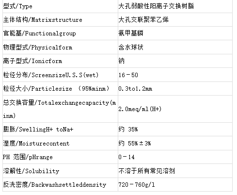 CH-93是包含氨甲膦酸基連接到聚苯乙烯共聚物的一種極耐用的大孔樹脂,是一種專門用于高鹽水除鈣鎂螯合樹脂。它從含有一價陽離子的廢水處理中選擇性的除去二價金屬陽離子。使二價金屬陽離子以及由其他二價陽離子可以像鈣一樣容易地從一價陽離子中分離出來。