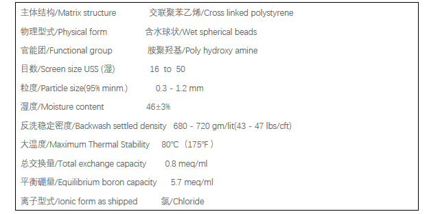 Tulsimer ?CH-99樹脂是一款骨架為一種苯乙烯和二乙烯苯交聯(lián)的樹脂,具有與硼能夠生成絡(luò)合物的功能基團多羥基胺(Polyhydroxy amine),這種化學(xué)結(jié)構(gòu)在官能團中具有多羥基部分與硼之間生成絡(luò)合陰離子,其胺基部分作為陰離子交換基捕捉生成的絡(luò)合陰離子,從而選擇吸附硼離子。
